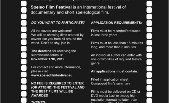 Due to increased last minute interest, the deadline for applications and submissions is prolonged till Monday 12.11.2018. Don’t be lazy . Join in. So far we received movies from UK, Germany, USA, Spain, France, Croatia, Moldova, Italy & Slovenia. This year SpeleoFilmFestival is going to be held together with annual meeting of […]